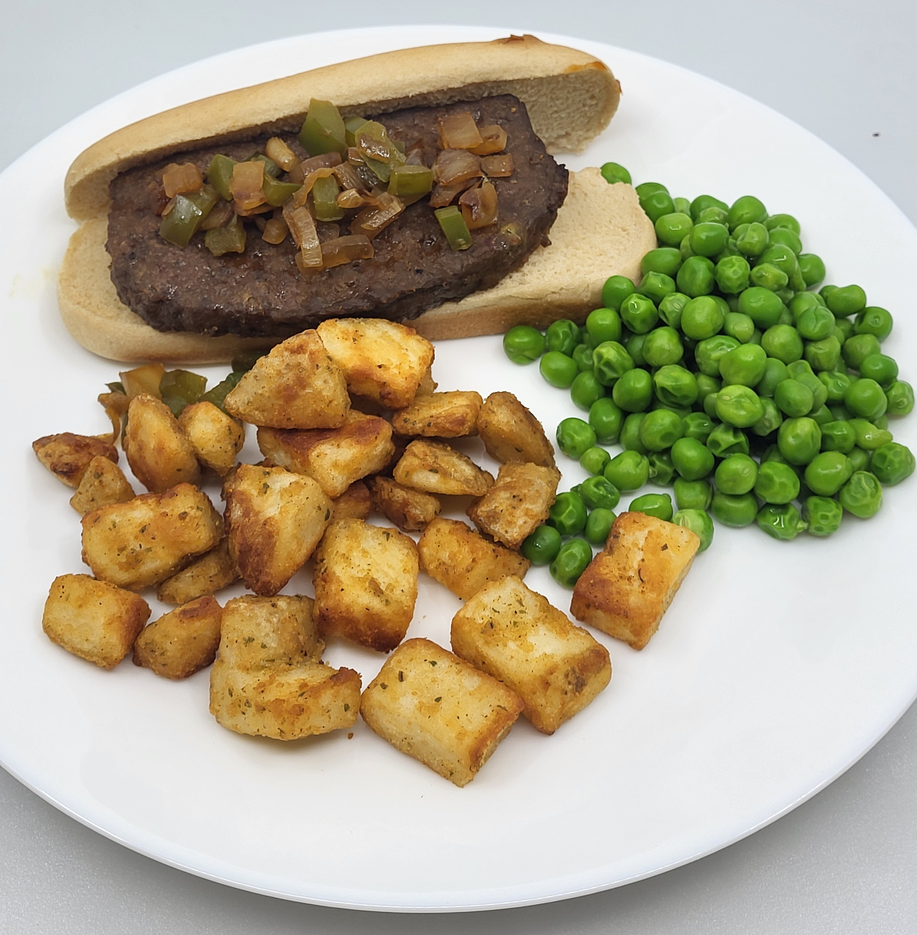 Ground Beef, Soy Flour, caramel color (contains sulfites), Ketchup (tomato concentrate from red ripe tomatoes, distilled vinegar, high fructose corn syrup, corn syrup, salt, spice, onion powder, natural flavoring), Onions, Green Peppers, Red Peppers, Water, SPM (Less than 2% of Modified Food Starch, Salt, Sugar, Food Gum, Calcium Chloride, Garlic Powder, Spice, and less than 2% Silica Gel to prevent caking), Worcestershire Sauce (Water, Worcestershire Sauce Powder (Maltodextrin, Worcestershire Sauce ((Distilled Vinegar, Molasses, Corn Syrup, Salt, Caramel Color, Garlic Powder, Sugar, Spices, Tamarind, Natural Flavor, Contains Sulfites)), and Silicon Dioxide), Prime Rib Flavoring (dehydrated vegetables ((onion, carrot, celery)), Spices including paprika, natural beef flavors on salt, caramel color, yeast extract, less than 5% Refined soybean oil), Garlic Powder, Spice, Salt
